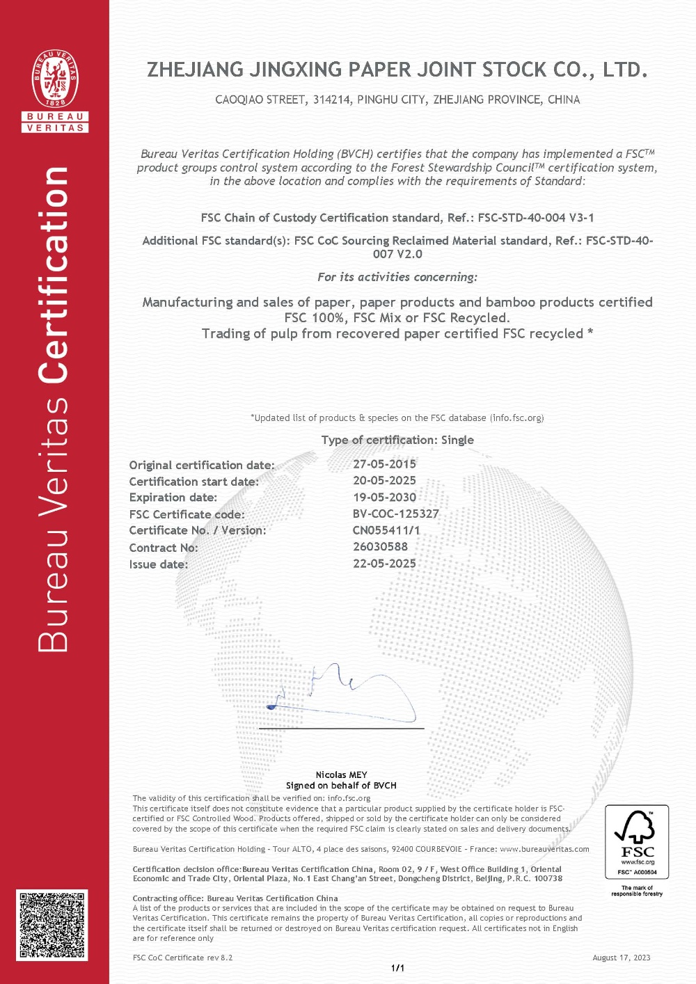Jingxing Paper took the lead in the same industry to pass the ISO9001 quality management system and ISO14001 environmental management system certification, in 2014 passed the OHSAS18001 occupational health and safety management system certification, in 2015 passed GB / T23331 energy management system and FSC? forest system certification, passed in 2018 Certification of integration management of two industries.